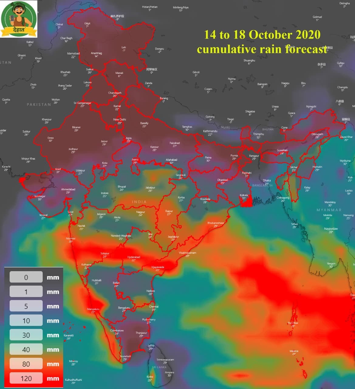 14 অক্টোবর 2020: মধ্য মহারাষ্ট্র, কোঙ্কন, গোয়া, মারাঠওয়াড়া এবং উত্তর অভ্যন্তরীণ কর্নাটকের কিছু এলাকায় ভারী থেকে খুব ভারী বৃষ্টিপাতের সম্ভাবনা রয়েছে। বিদর্ভ, তেলেঙ্গানা, কেরালা, মাহে এবং দক্ষিণ অভ্যন্তরীণ কর্নাটকের কিছু এলাকায় ভারী বৃষ্টিপাতের সম্ভাবনা রয়েছে। মধ্যপ্রদেশ, বিদর্ভ, ছত্তিশগড়, গুজরাট, মধ্য মহারাষ্ট্র, মারাঠওয়াড়া, কোঙ্কন, গোয়া, উপকূলীয় অন্ধ্রপ্রদেশ, ইয়ানাম, তেলেঙ্গানা, রায়লসীমা, কর্ণাটক, কেরালা এবং মাহেতে বজ্রপাতসহ বজ্রপাতের সম্ভাবনা রয়েছে। আন্দামান সাগর, পূর্ব-মধ্য আরব সাগর, মহারাষ্ট্র উপকূলের কাছাকাছি প্রবল বাতাসের গতি 40-50 কিলোমিটার পর্যন্ত পৌঁছানোর সম্ভাবনা রয়েছে। মৎস্যজীবীদের এসব এলাকা থেকে দূরে থাকার পরামর্শ দেওয়া হচ্ছে।