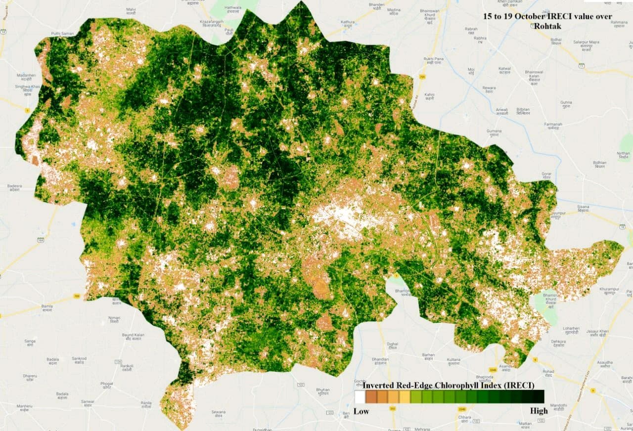 IRECI is the optimal red edge index for evaluating the vegetation health status using #Sentinel2 imagery. IRECI is the most sensitive to the crop health status among the others indices. Green colour indicating high chlorophyll value ( #Rohtak , #Haryana ).