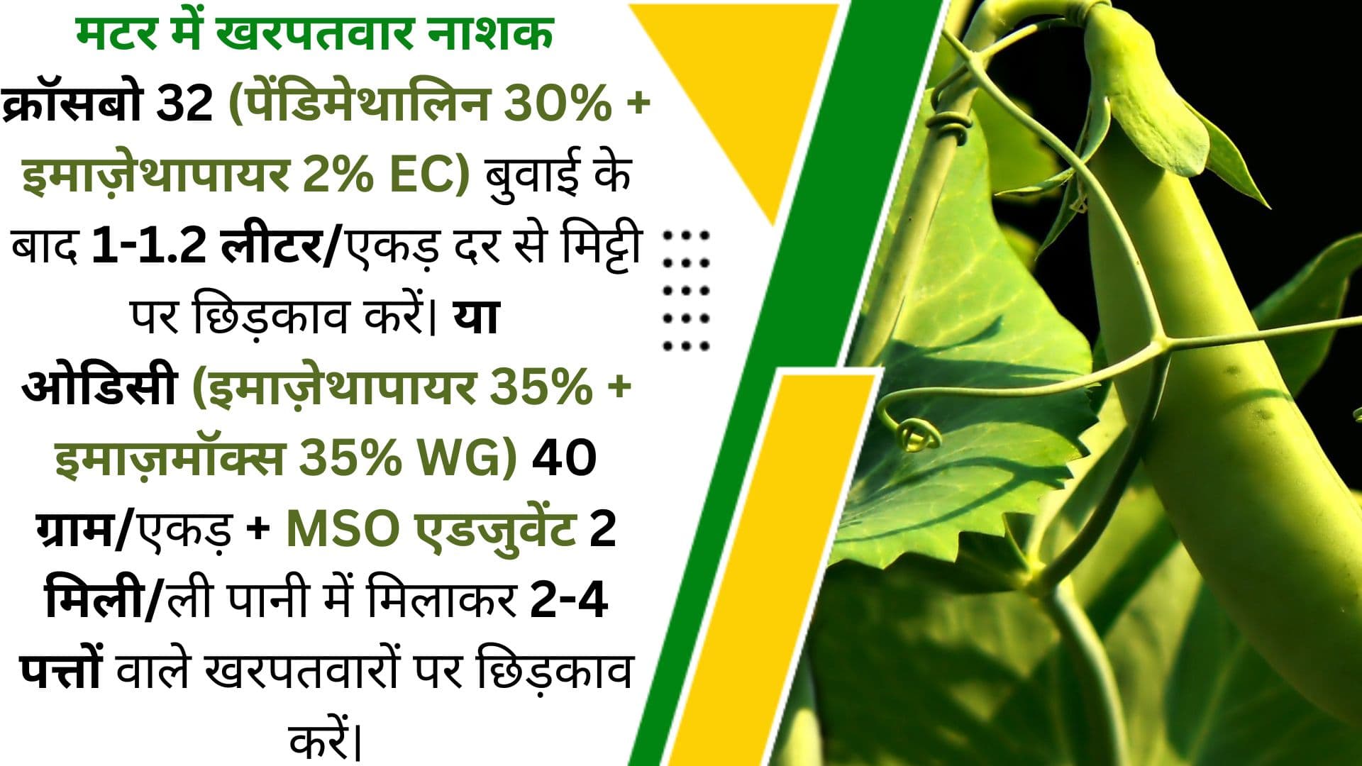 क्या आप मटर की खेती करते हैं? खरपतवार नियंत्रण के लिए सही दवा का उपयोग करें और अपनी फसल को सुरक्षित रखें। ऐसे ही खेती से जुड़े टिप्स और जानकारी के लिए हमारे पेज को फॉलो करें और यह पोस्ट अपने दोस्तों के साथ जरूर शेयर करें!
