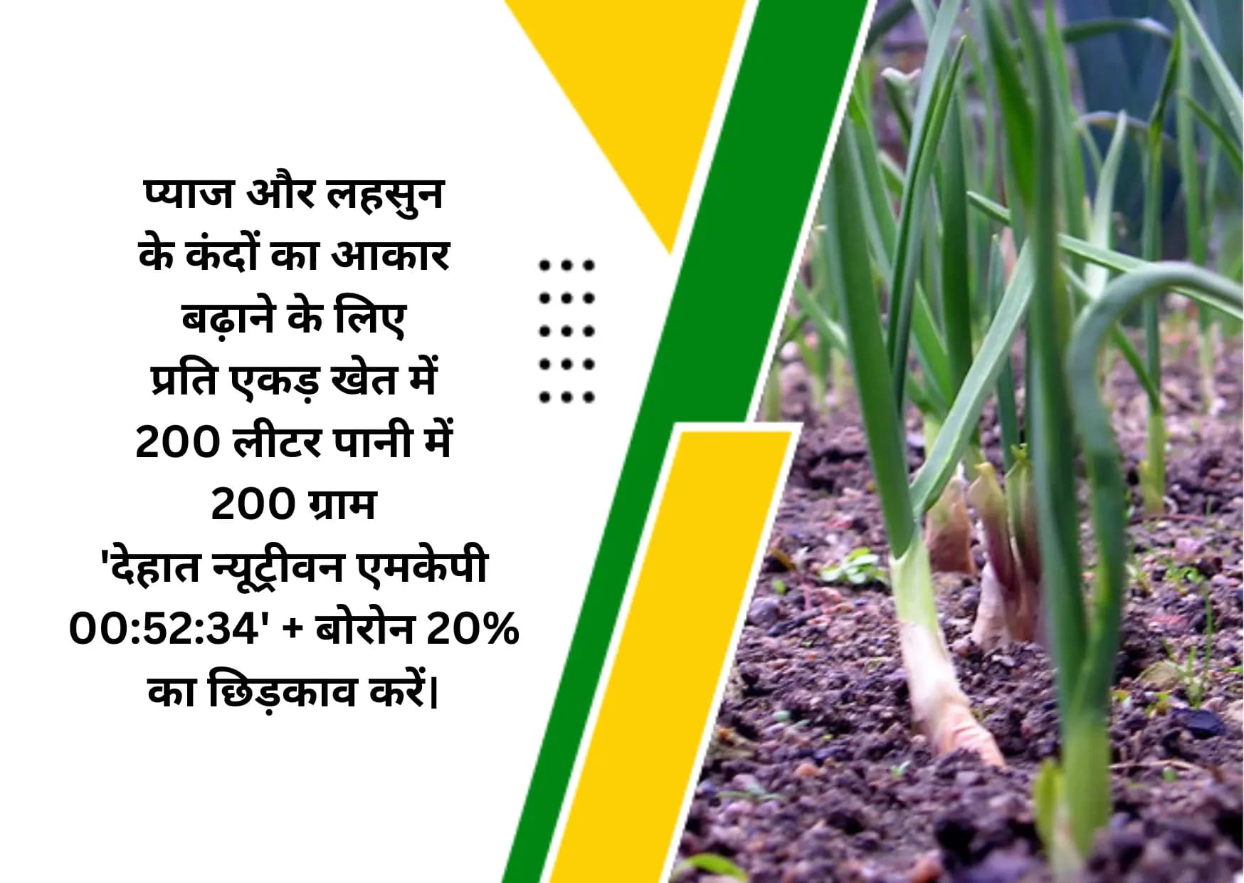 प्याज एवं लहसुन के कंदों के आकार में वृद्धि के लिए उर्वरकों का महत्वपूर्ण योगदान है। प्याज और लहसुन के कंदों का आकार बढ़ाने के लिए प्रति एकड़ खेत में 200 लीटर पानी में 200 ग्राम 'देहात न्यूट्रीवन एमकेपी 00:52:34' + बोरोन 20% का छिड़काव करें। इसके अलावा सल्फर का प्रयोग भी प्याज एवं लहसुन के कंदों के आकार में बढ़ोतरी में लाभदायक होता है। खेत में खरपतवारों पर भी नियंत्रण रखें। खरपतवारों के कारण फसलों को उचित मात्रा में पोषक तत्व नहीं मिल पाता है।