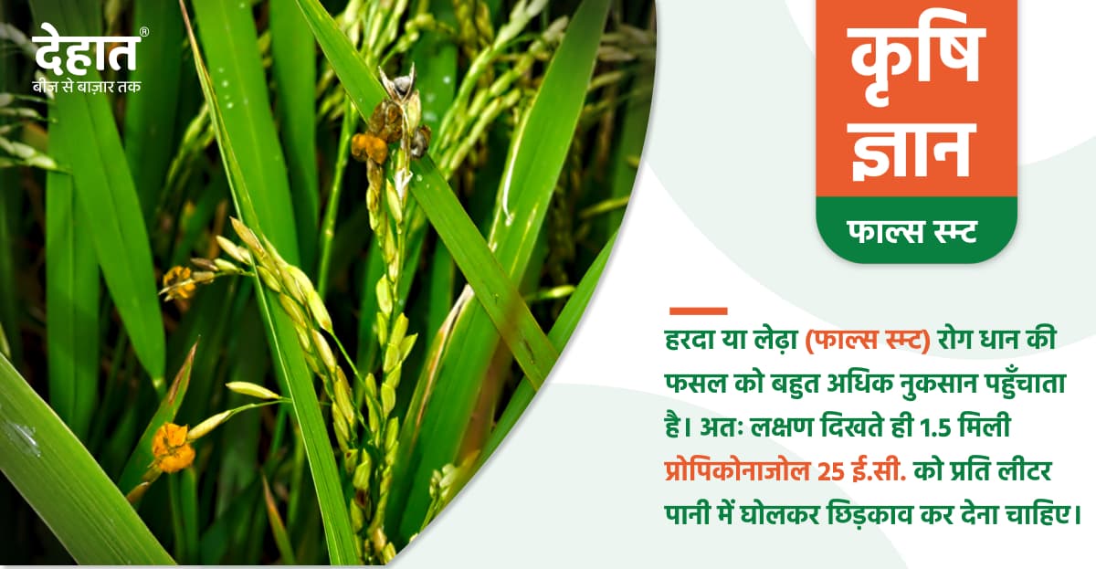 હરદા અથવા લેધા (ખોટા સ્મટ) રોગમાં, ડાંગરના કાન પર કાળા અથવા પીળાશ પડતા વટાણા જેવો આકાર દેખાય છે. આ પાક લણણીના છેલ્લા સમયે ડાંગરના દાણાની ગુણવત્તાને બગાડે છે. દરરોજ રોગ ખૂબ જ ઝડપથી ફેલાય છે. તેથી, લક્ષણો દેખાય કે તરત જ 1.5 મિલી પ્રોપીકોનાઝોલ 25 ઇસી. તેને એક લિટર પાણીમાં ઓગાળીને છંટકાવ કરવો જોઈએ.