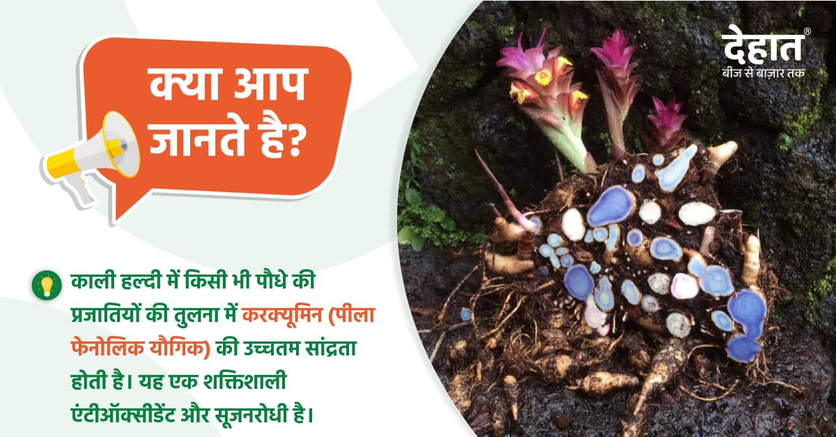 काली हल्दी एक दुर्लभ पौधा है जिसका औषधीय उपयोग का बहुत लंबा इतिहास है। यह उत्तरपूर्वी और मध्य भारत की मूल निवासी है,जहां यह सांस्कृतिक समारोहों और औषधीय उपचारों का हिस्सा है।काली हल्दी नारंगी रंग की विविधता के समान लाभ प्रदान करती है,इसमें किसी भी पौधे की प्रजातियों की तुलना में करक्यूमिन (पीला फेनोलिक यौगिक) की उच्चतम सांद्रता होती है। यह एक शक्तिशाली एंटीऑक्सीडेंट और सूजनरोधी है।