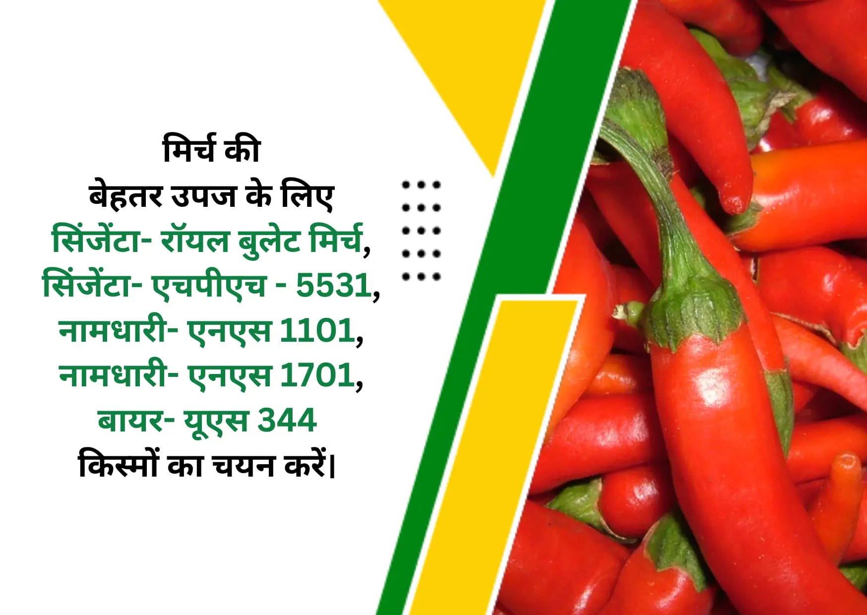 हमारे देश में मिर्च का रंग, आकार, तीखेपन व उपयोग के आधार पर इसकी 50 से अधिक किस्में मौजूद हैं। बेहतर उपज के लिए रोग रहित बीज का चयन करें। मिर्च के प्रकार की बात करें तो इसकी बेहतर उपज के लिए सिंजेंटा- रॉयल बुलेट मिर्च, सिंजेंटा- एचपीएच - 5531, नामधारी- एनएस 1101, नामधारी- एनएस 1701, बायर- यूएस 344 किस्मों का चयन करें।