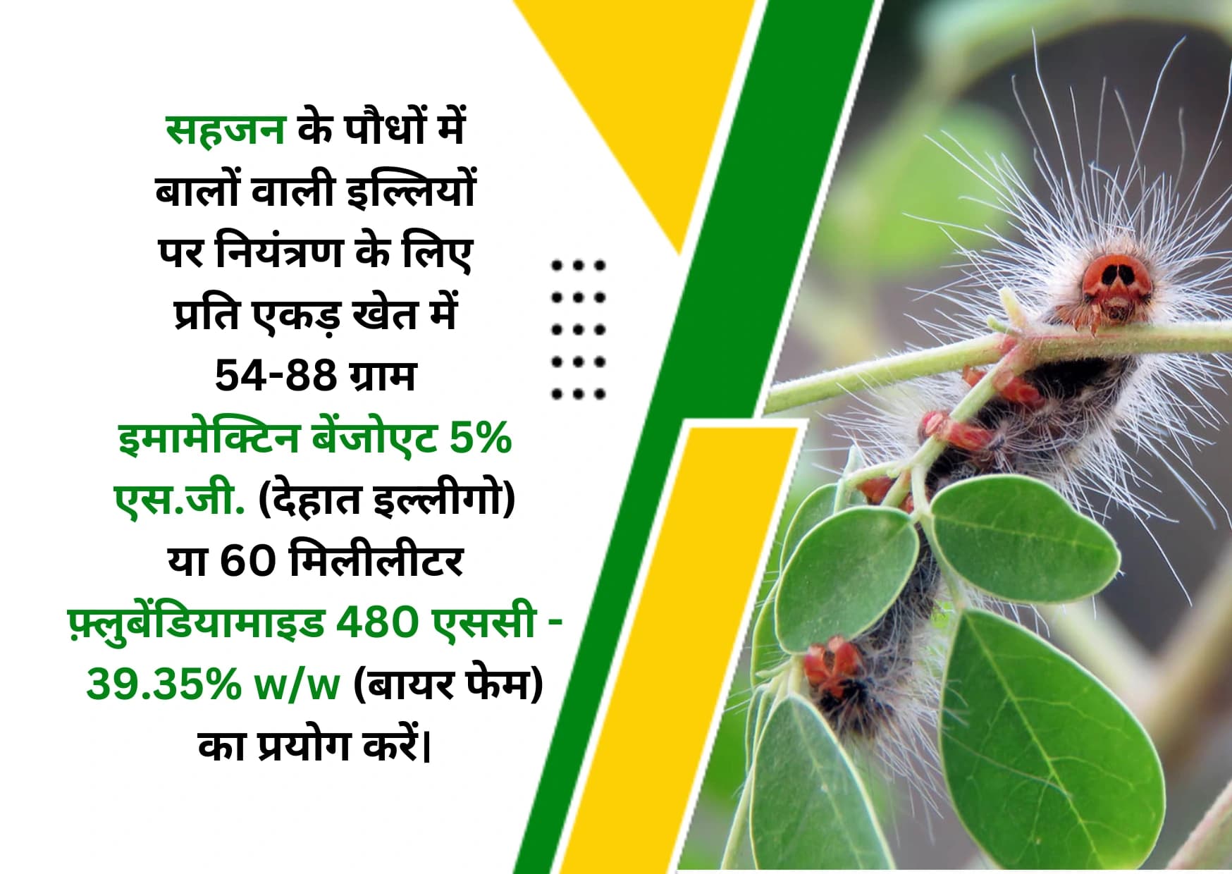 सहजन के पौधों में माहु, सफेद मक्खी, तना छेदक, जैसे कई तरह के कीटों का प्रकोप होता है। इन कीटों के अलावा पौधों में बालों वाली इल्लियों का प्रकोप एक सामान्य लेकिन बड़ी समस्या है। यह पौधों के तने पर बड़ी संख्या में रहते हैं और तेजी से बढ़ते हुए तने को ढक लेते हैं। इस कीट पर नियंत्रण के लिए प्रति एकड़ खेत में 54-88 ग्राम इमामेक्टिन बेंजोएट 5% एस.जी. (देहात इल्लीगो) का प्रयोग करें। प्रति एकड़ खेत में 60 मिलीलीटर फ़्लुबेंडियामाइड 480 एससी - 39.35% w/w (बायर फेम) का भी प्रयोग कर सकते करें।