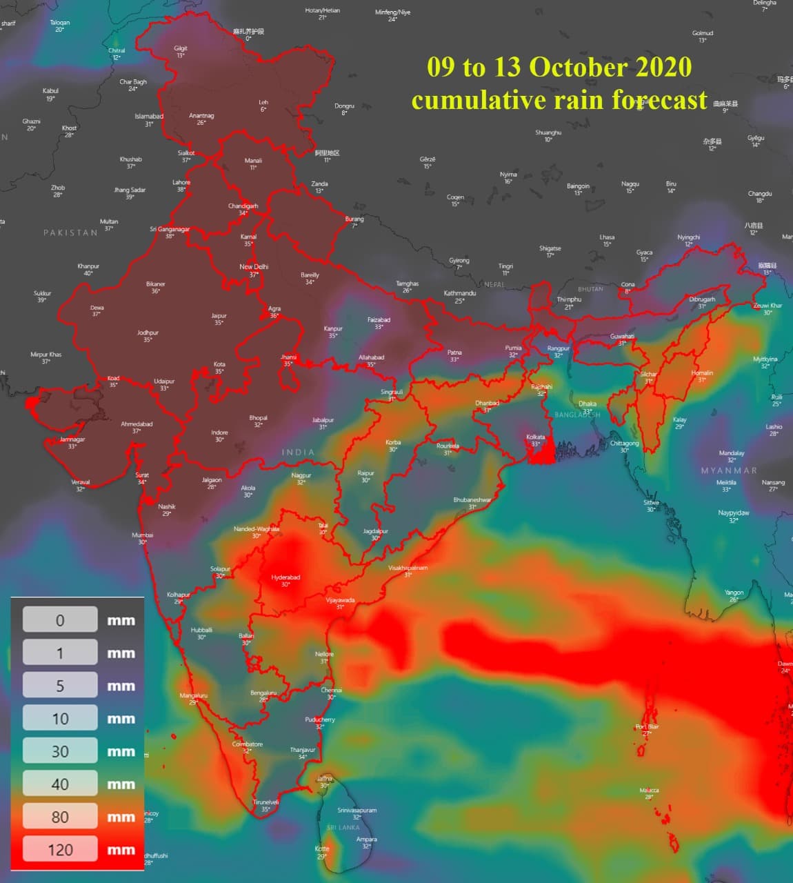 10 October 2020: Vidarbha, Andaman & Nicobar Islands, Madhya Maharashtra, Marathwada, Coastal region of Andhra Pradesh, Yanam, Telangana, Rayalaseema and some areas of Interior Karnataka are likely to receive heavy rainfall. Light rain and thundershowers can be heard in some areas of East Uttar Pradesh, Madhya Pradesh, Chhattisgarh, Andaman & Nicobar Islands, Maharashtra and Goa. Strong wind speed reaching 45-55 kmph very likely over West-central & North Bay of Bengal, Coastal areas of Andhra Pradesh and Odisha, Andaman Sea. Fishermen are advised to stay away from these areas.