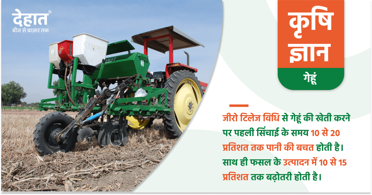 जीरो टिलेज विधि एक ऐसी तकनीक है जिसमें गेहूं की बुवाई से पहले खेत की जुताई की आवश्यकता नहीं होती है। इस विधि से गेहूं की खेती करने पर पहली सिंचाई के समय 10 से 20 प्रतिशत तक पानी की बचत होती है। केवल इतना ही नहीं फसल के उत्पादन में भी 10 से 15 प्रतिशत तक बढ़ोतरी होती है। जिससे गेहूं की खेती में होने वाली लागत में कमी आती है और समय की भी बचत होती है।