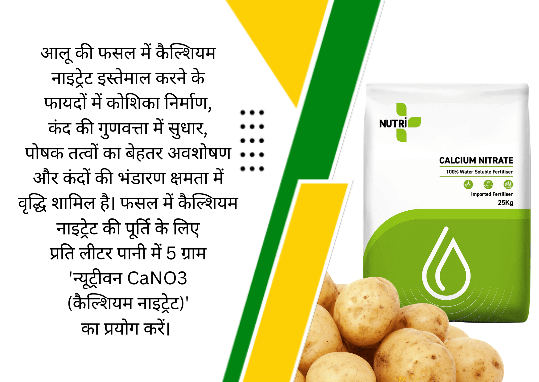 कैल्शियम नाइट्रेट आलू के लिए एक बेहतरीन उर्वरक है। इसके इस्तेमाल से फसल में कैल्शियम और नाइट्रोजन दोनों की कमी दूर होती है, जिससे आलू के कंदों का बेहतर विकास होता है। कैल्शियम कोशिका निर्माण में मदद करता है, कंद की गुणवत्ता में सुधार करता है। इसके साथ ही यह पोषक तत्वों का अवशोषण और कंदों की भंडारण क्षमता को बढ़ाने में भी सहायक है। नाइट्रोजन वानस्पतिक विकास में मदद करता है। अगर आप भी कर रहे हैं आलू की खेती तो प्रति लीटर पानी में 5 ग्राम 'न्यूट्रीवन CaNO3 (कैल्शियम नाइट्रेट)' का प्रयोग करें।