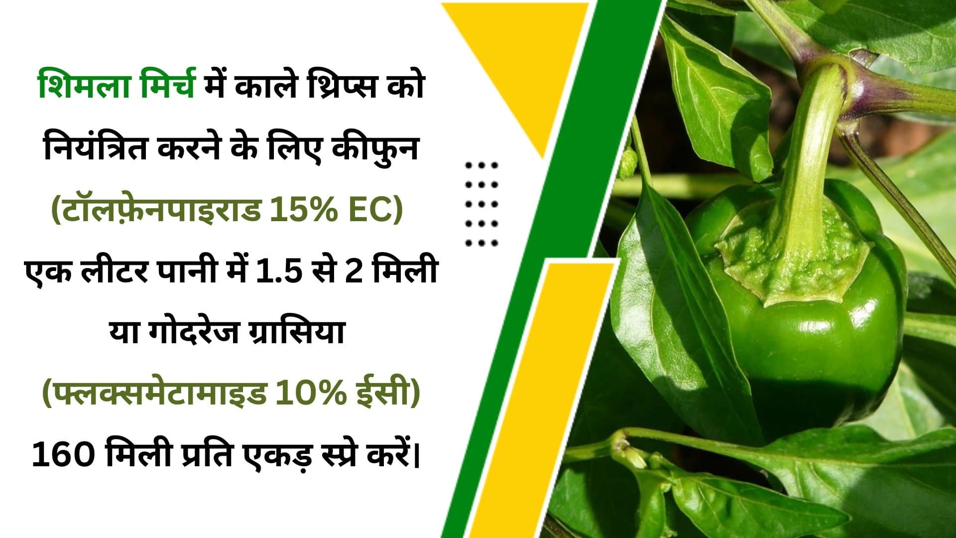 काले थ्रिप्स शिमला मिर्च की फसल को गंभीर नुकसान पहुंचा सकते हैं, जिससे उत्पादन में कमी हो जाती है। इसे नियंत्रित करने के लिए कीफुन (टॉलफ़ेनपाइराड 15% EC) का 1.5 से 2 मिली प्रति लीटर पानी में घोल बनाकर स्प्रे करें। इसके साथ ही गोदरेज ग्रासिया (फ्लक्समेटामाइड 10% ईसी) का 160 मिली प्रति एकड़ की दर से स्प्रे करें। यह संयोजन थ्रिप्स के प्रकोप को प्रभावी ढंग से नियंत्रित करता है और फसल को स्वस्थ बनाए रखने में मदद करता है, जिससे उपज बढ़ने की संभावना रहती है।