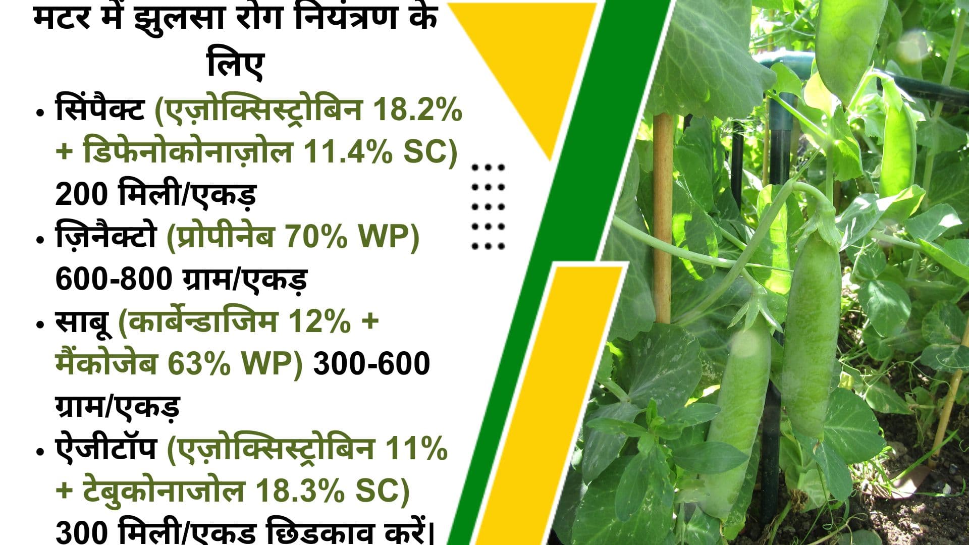 मटर की फसल को झुलसा रोग से बचाने के लिए सही फफूंदनाशकों का उपयोग करना आवश्यक है। इस रोग के प्रबंधन के लिए डीएम-45 (मैंकोजेब 75% WP) 600-800 ग्राम, सिंपैक्ट (एज़ोक्सिस्ट्रोबिन 18.2% + डिफेनोकोनाज़ोल 11.4% SC) 200 मिली, ज़िनैक्टो (प्रोपीनेब 70% WP) 600-800 ग्राम, साबू (कार्बेन्डाजिम 12% + मैंकोजेब 63% WP) 300-600 ग्राम, और ऐजीटॉप (एज़ोक्सिस्ट्रोबिन 11% + टेबुकोनाजोल 18.3% SC) 300 मिली प्रति एकड़ छिड़काव करें। इनका उपयोग सही मात्रा और समय पर करने से फसल को स्वस्थ रखा जा सकता है और झुलसा रोग से बचाव किया जा सकता है।
