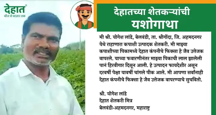 काही दिवसांपूर्वी आम्ही बेलवंडी, ता. श्रीगोंदा, जि. अहमदनगर येथे राहणारे शेतकरी श्री. योगेश लांडे यांची भेट घेतली. योगेशजी हे कपाशीची शेती करतात. त्यांच्या सांगण्यानुसार यावर्षी त्यांनी आपल्या शेतात देहात कंपनीचे फिक्सा हे जैव उत्तेजक फवारले. याच्या वापरानंतर त्यांच्या पिकाची लाल झालेली पानं हिरवीगार झाली, पात्यांची संख्या वाढली, फुल लागली. तसेच फिक्सा वनस्पतीच्या विविध शारीरिक आणि जैव रासायनिक प्रक्रिया सक्रिय करते ज्यामुळे, उत्पादकता आणि उत्पादनाची गुणवत्ता देखील चांगली झाली. देहातचे जैव उत्तेजक वापरण्याचा त्यांचा निर्णय नफा वाढीसाठी फायदेशीर ठरत आहे.