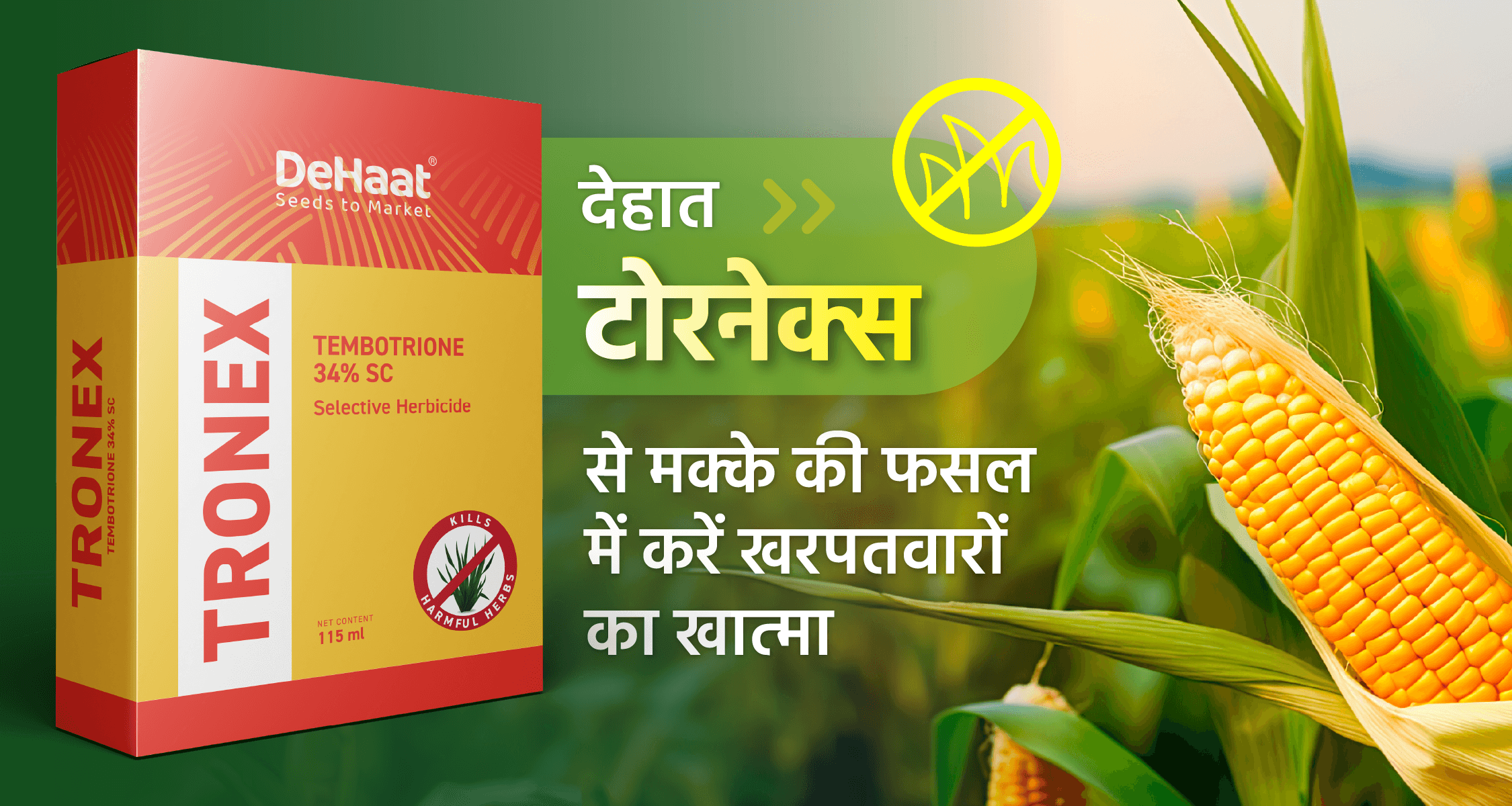 मक्के की फसल में खरपतवारों का खात्मा करने के लिए 'देहात ट्रोनेक्स' का इस्तेमाल करें। ट्रोनेक्स टेम्बोट्रियोन 34.4% एससी युक्त एक पोस्ट-एमर्जेंस खरपतवार नाशक है, इसका उपयोग मक्के की फसल में चौड़ी पत्ती वाले खरपतवार, घास एवं अन्य खरपतवारों को नियंत्रित करने में सहायक है।