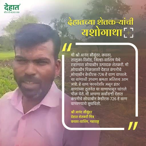 काही दिवसांपूर्वी आम्ही कवठा, तालुका-रिसोड, जिल्हा-वाशिम येथे राहणारे शेतकरी श्री आनंद सौसुंदर यांची भेट घेतली. आनंदजी हे सोयाबीनची शेती करतात. त्यांच्या सांगण्यानुसार यावर्षी त्यांनी आपल्या शेतात देहात कंपनीचे सोयाबीन केडीएस-726 हे वाण वापरले. या वाणाची उगवण क्षमता चांगली असून, 90 ते 95 टक्के उगवण क्षमता दिसून आली. हे वाण 105 ते 110 दिवसांमध्ये कापणीसाठी तयार होते. याची अंकुरण क्षमता इतर कोणत्याही लोकल वाणांपेक्षा चांगली आहे. हे वाण गंज व खोडमाशीसाठी प्रतिरोधक असून उत्पन्न जास्त आहे. देहातचे वाण वापरण्याचा त्यांचा निर्णय नफा वाढीसाठी फायदेशीर ठरत आहे.