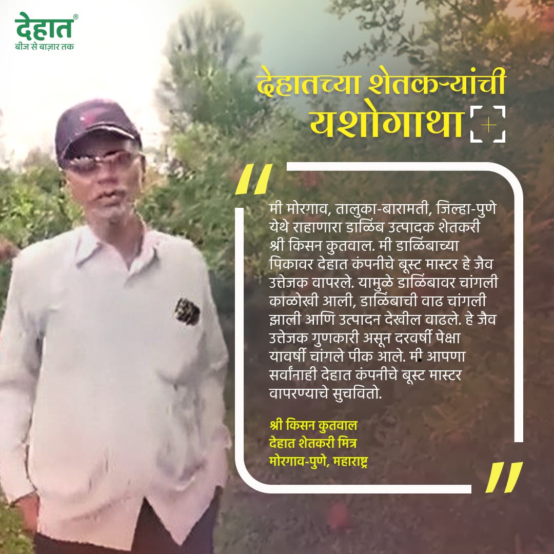 काही दिवसांपूर्वी आम्ही पुणे, बारामती येथील मोरगाव येथे राहणारे शेतकरी श्री किसन कुतवाल यांची भेट घेतली. किसनजी हे डाळिंबाची शेती करतात. त्यांच्या सांगण्यानुसार त्यांनी डाळिंबाच्या पिकात देहातचे बूस्ट मास्टर हे उत्पादन वापरले. याच्या वापरामुळे त्यांच्या डाळिंबाच्या पिकात चांगली काळोखी दिसून आली. तसेच, रोपांची वाढ उत्तम झाली आणि दरवर्षी पेक्षा यावर्षी उत्पादनातही वाढ झाल्याचे दिसून आले. किसनजींना देहातचे कोणतेही उत्पादन खरेदी करायचे असल्यास ते जवळच्या देहात सेंटरला भेट देतात. देहात कंपनीचे बूस्ट मास्टर वापरून ते अतिशय खुश आहेत. देहातशी जोडले जाण्याचा त्यांचा निर्णय नफा वाढीसाठी फायदेशीर ठरत आहे.