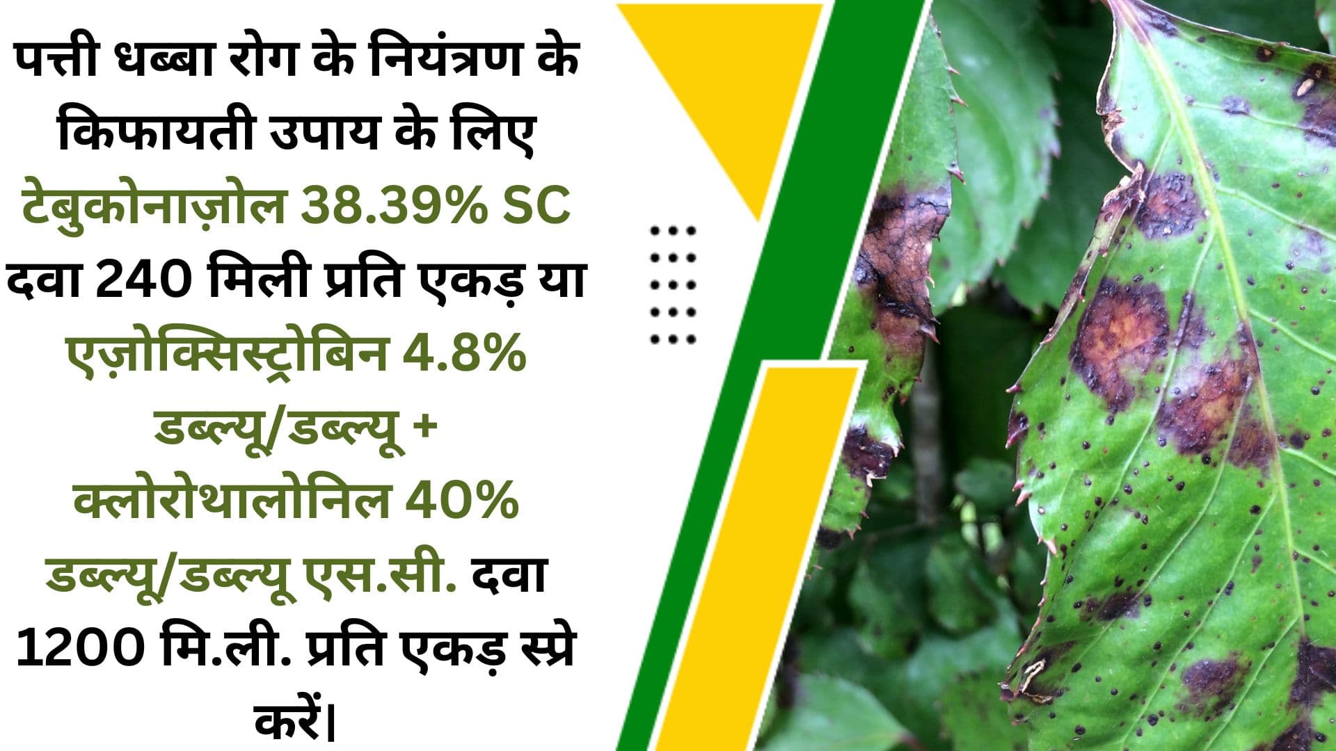 पत्ती धब्बा रोग की समस्या से फसल को बचाना अब हुआ आसान! यदि यह रोग बैक्टीरिया या फंगस के कारण हो, तो टेबुकोनाज़ोल 38.39% SC का उपयोग 240 मिली प्रति एकड़ की मात्रा में स्प्रे करें। एज़ोक्सिस्ट्रोबिन 4.8% डब्ल्यू/डब्ल्यू + क्लोरोथालोनिल 40% डब्ल्यू/डब्ल्यू एससी 1200 मि.ली. प्रति एकड़ स्प्रे करना लाभकारी होगा। इन किफायती उपायों से फसल को स्वस्थ और हरा-भरा बनाए रखें।