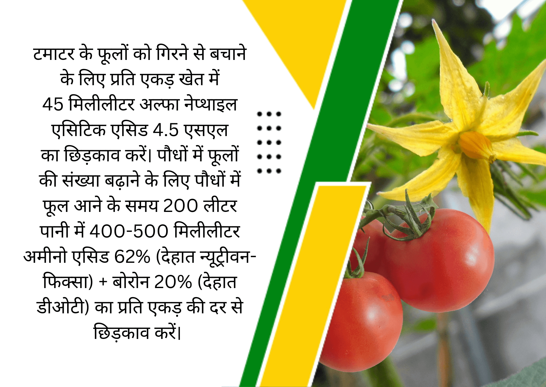 टमाटर के फूलों के झड़ने के कई कारण हो सकते हैं। जिनमें पोषक तत्वों की कमी, जलवायु में परिवर्तन एवं अथिक ठंड और पाला पड़ना शामिल है। इसके अलावा कई बार फूल आने के समय अधिक मात्रा में रसायनों का छिड़काव करना भी फूलों के गिरने का कारण बन सकता है। अगर आप कर रहे हैं टमाटर की खेती और पौधों में हो रही है फूलों के गिरने की समस्या तो नियंत्रण के लिए प्रति एकड़ खेत में 45 मिलीलीटर अल्फा नेप्थाइल एसिटिक एसिड 4.5 एसएल (बायर प्लानोफिक्स) का छिड़काव करें। टमाटर के पौधों में फूलों की संख्या बढ़ाने के लिए पौधों में फूल आने के समय 200 लीटर पानी में 400-500 मिलीलीटर अमीनो एसिड 62% (देहात न्यूट्रीवन- फिक्सा) + बोरोन 20% (देहात डीओटी) का प्रति एकड़ की दर से छिड़काव करें। इस छिड़काव के 7 दिनों बाद प्रति लीटर पानी में 5 ग्राम फ्लॉवरिंग स्पेशल फ़र्टिलाइज़र (देहात देहात न्यूट्रीवन- -9:27:18+TE) मिला कर छिड़काव करें।