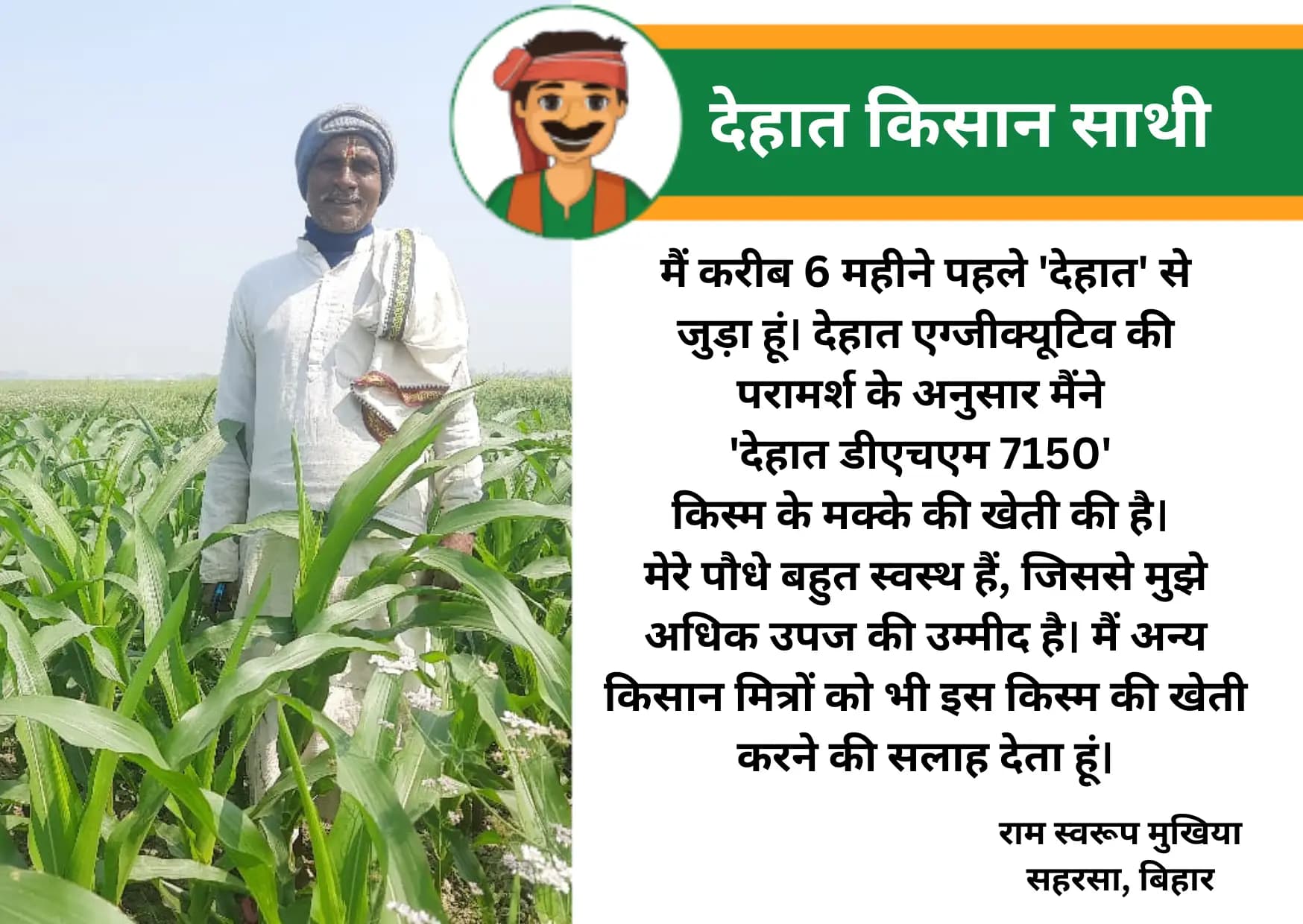 मिलिए सहरसा, बिहार के रहने वाले प्रगतिशित किसान राम स्वरूप मुखिया जी से। देहात से जुड़े हुए इन्हें करीब 6 महीने हो गए हैं। इस मौसम इन्होंने अपनी खेत में मक्के की फसल लगाई है। देहात एग्जीक्यूटिव की परामर्श के अनुसार इस बार इन्होंने 'देहात डीएचएम 7150' किस्म के मक्के की बुवाई की है। इन्होंने फसलों में देहात के कई उत्पादों का इस्तेमाल किया है। इनकी खेत में जा कर देखने पर फसल बहुत स्वस्थ नजर आए। परिणाम से संतुष्ट राम स्वरूप जी को इस बार अधिक उपज की उम्मीद है और ये अन्य किसान मित्रों को भी मक्के की इस किस्म की बुवाई करने की सलाह देते हैं।