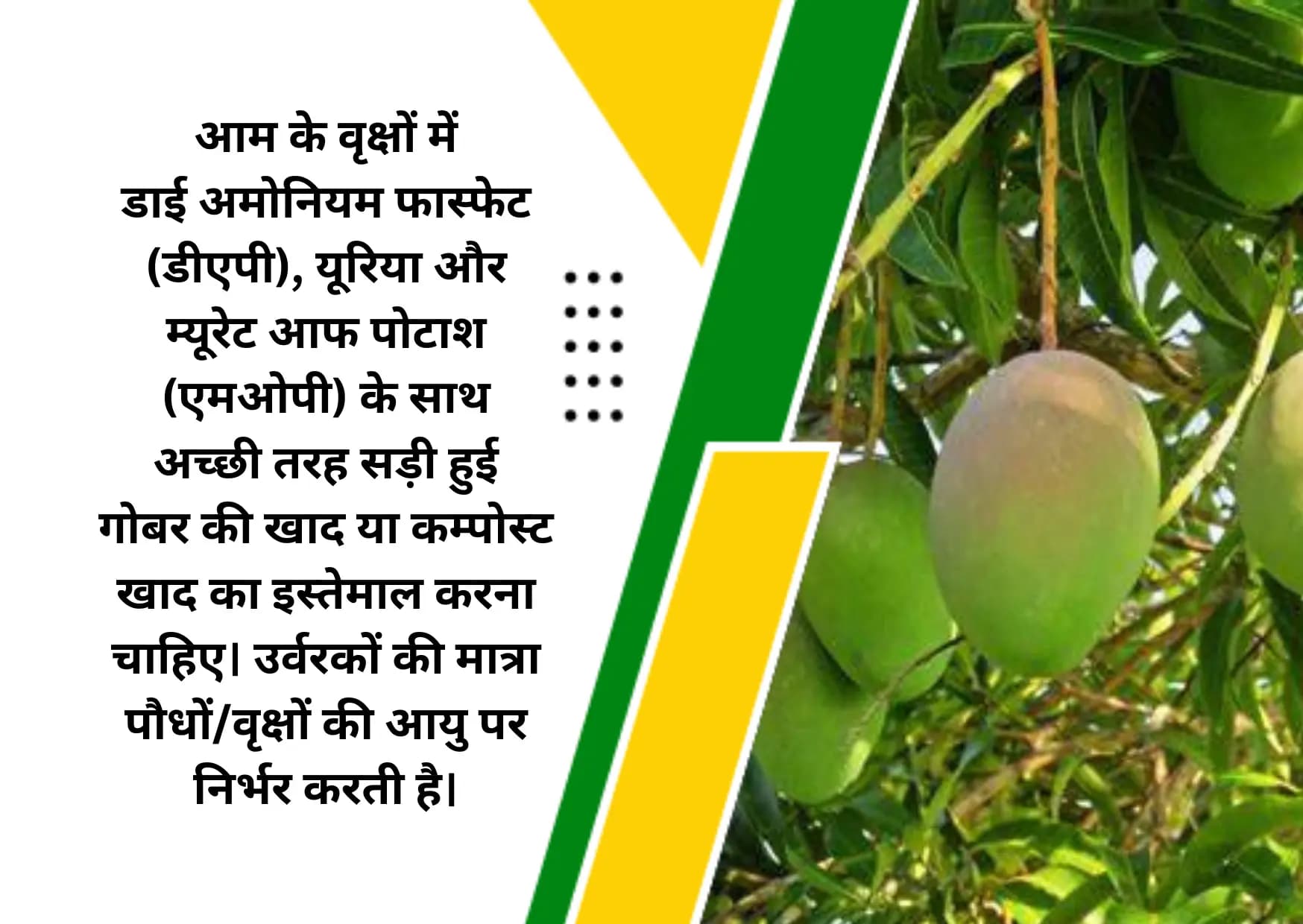 आम के वृक्षों में डाई अमोनियम फास्फेट (डीएपी), यूरिया और म्यूरेट आफ पोटाश (एमओपी) के साथ अच्छी तरह सड़ी हुई गोबर की खाद या कम्पोस्ट खाद का इस्तेमाल करना चाहिए। इसके अलावा जिंक, कॉपर और बोरॉन जैसे सूक्ष्म पोषक तत्वों का प्रयोग भी लाभदायक साबित होता है। उर्वरकों की मात्रा पौधों/वृक्षों की आयु पर निर्भर करती है। 1 वर्ष के प्रत्येक पौधे में प्रति वर्ष 10 किलोग्राम सड़ी हुई गोबर की खाद, 217 ग्राम यूरिया, 312 ग्राम एसएसपी, 167 ग्राम एमओपी की आवश्यकता होती है। समय के साथ वर्ष में गुणांक के अनुसार उर्वरक की मात्रा बढ़ती जाएगी। यानी 10 वर्ष के एक वृक्ष को प्रति वर्ष 2.17 किलोग्राम यूरिया, 3.12 किलोग्राम एसएसपी, 1.67 किलोग्राम एमओपी की आवश्यकता होगी। इसके साथ 250 ग्राम जिंक सल्फेट 250 ग्राम कॉपर सल्फेट और 125 ग्राम बोरेक्स का भी प्रयोग करें।
