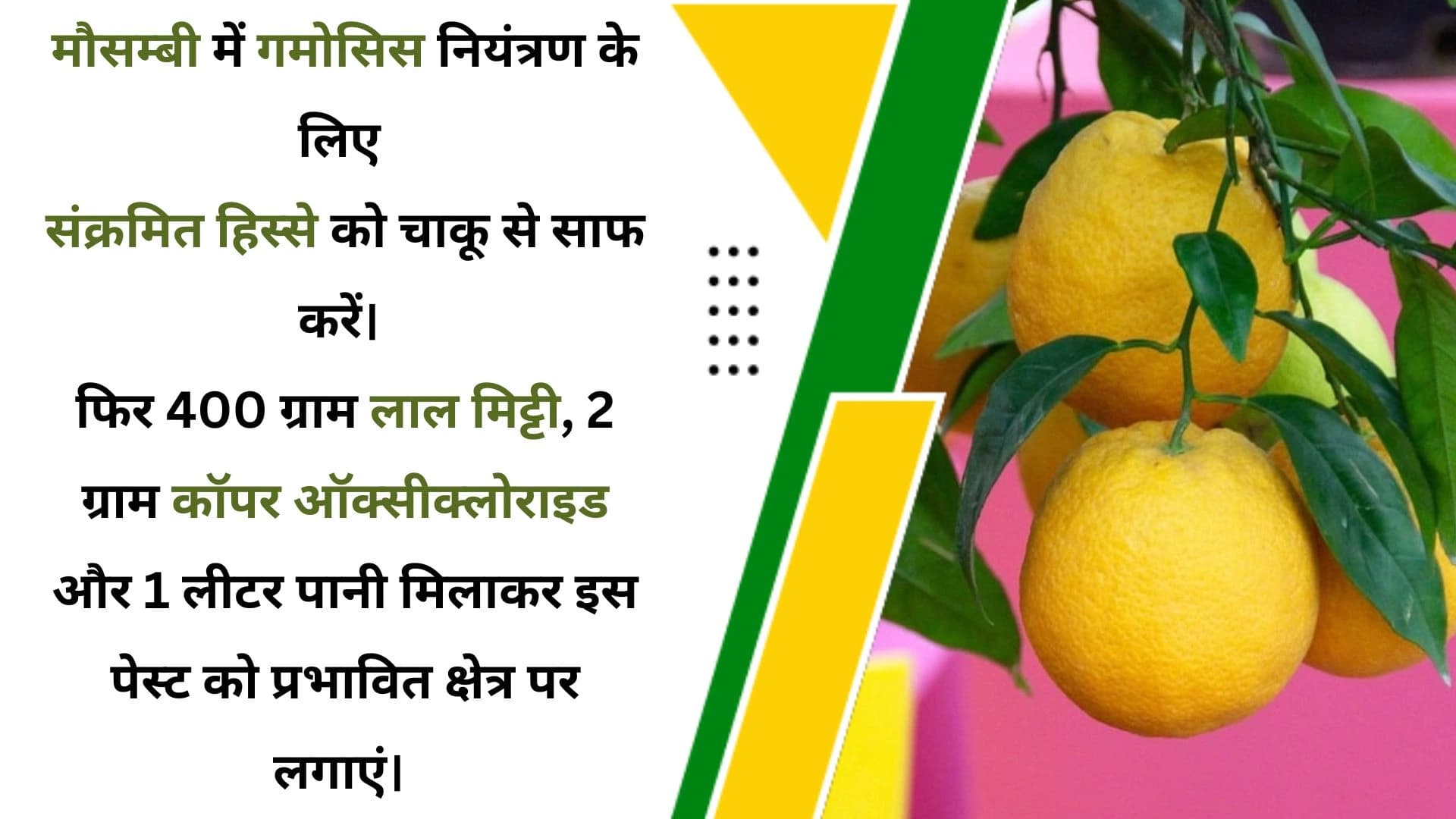 मौसम्बी में गमोसिस रोग का प्रभावी नियंत्रण करने के लिए सबसे पहले संक्रमित हिस्से को चाकू से साफ करना आवश्यक है। इसके बाद, 400 ग्राम लाल मिट्टी , 2 ग्राम कॉपर ऑक्सीक्लोराइड और 1 लीटर पानी मिलाकर एक पेस्ट तैयार करें। इस पेस्ट को प्रभावित क्षेत्र पर अच्छी तरह लगाएं, क्योंकि यह रोग के प्रभाव को कम करने में सहायक होगा।