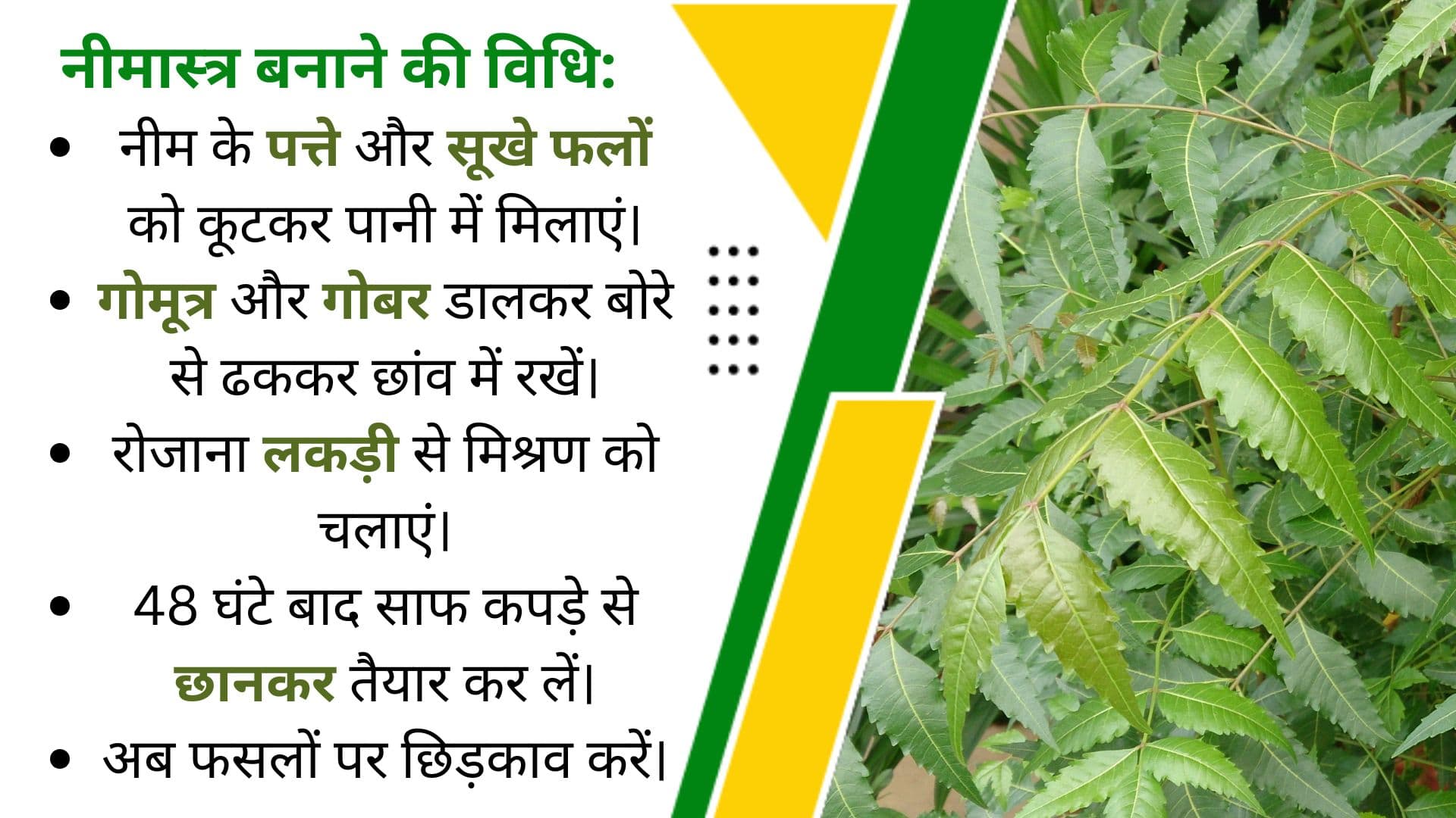 नीमास्त्र एक प्रभावी जैविक कीटनाशक है, जिसे आप अपने खेतों में कीटों से निपटने के लिए उपयोग कर सकते हैं। यह पर्यावरण के अनुकूल और प्राकृतिक तरीके से खेती को सुरक्षित बनाता है। इस कीटनाशक को बनाने के लिए नीम के पत्ते , गोमूत्र , गोबर और पानी का उपयोग किया जाता है, जो आसानी से उपलब्ध होते हैं। इसके छिड़काव से फसलों को न केवल कीटों से बचाया जा सकता है, बल्कि यह एक कारगर प्राकृतिक उर्वरक भी है।