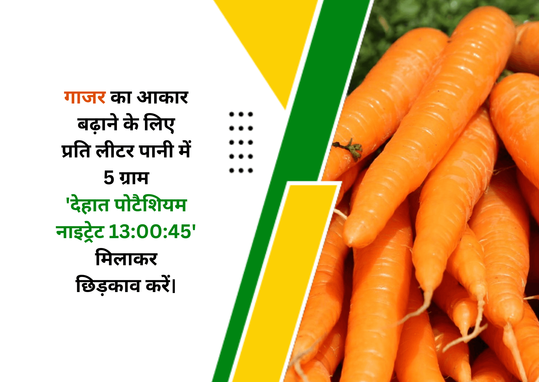 गाजर की खेती में अच्छा मुनाफा प्राप्त करने के लिए गाजर का आकार बढ़ाना आवश्यक है। इसके लिए सही समय पर पोषक का इस्तेमाल करना बहुत जरूरी है। बुवाई के 25-30 दिनों बाद प्रति लीटर पानी में 5 ग्राम 'देहात पोटेशियम नाइट्रेट 13:00:45' मिलाकर छिड़काव करें। इसके साथ ही बुवाई के 30-35 दिनों बाद प्रति लीटर पानी में 2-3 मिलीलीटर 'देहात बूस्ट मास्टर' मिला कर छिड़काव करें।