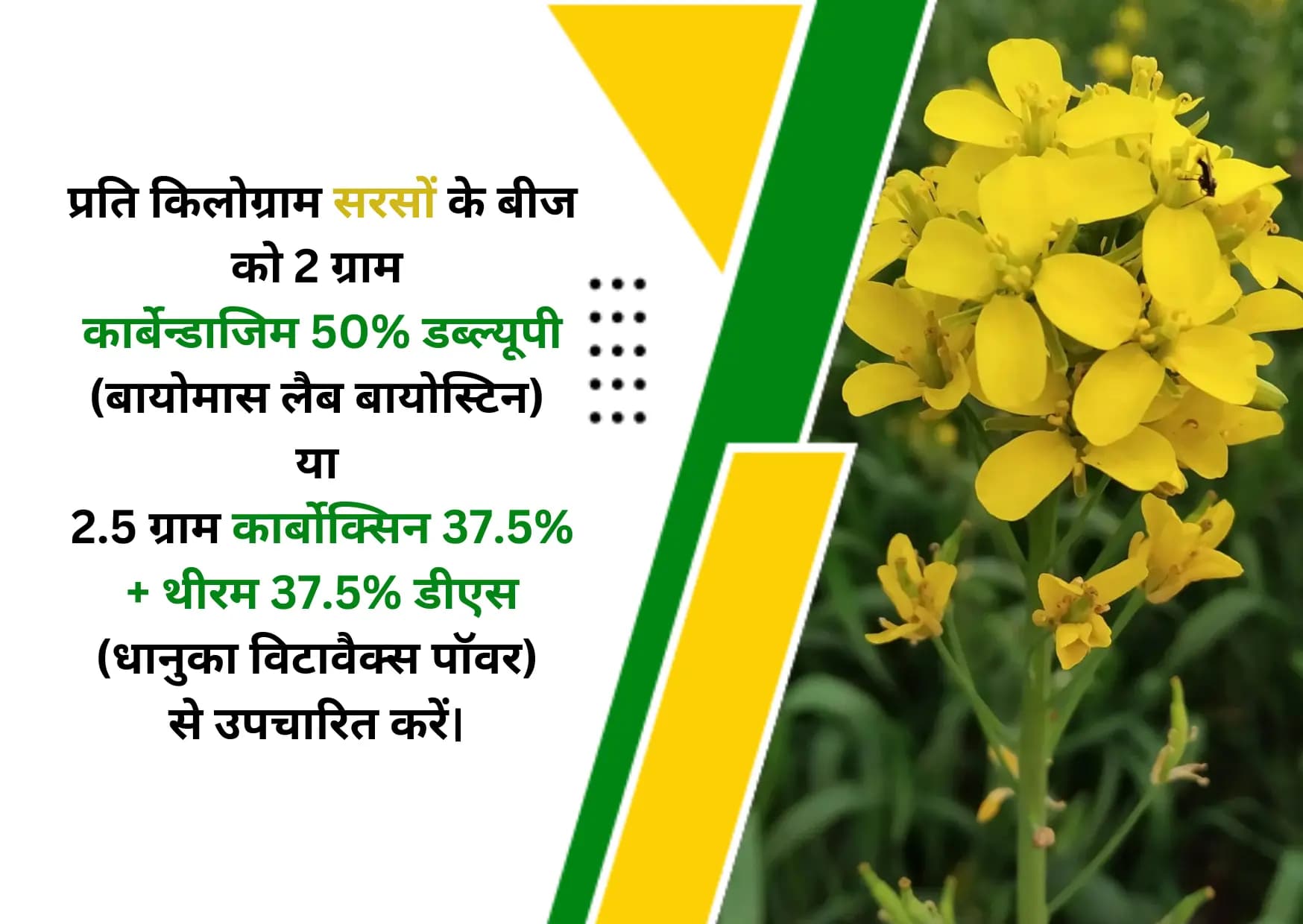 सरसों की फसल में कई तरह के रोगों की समस्या होती है। जिससे फसल की उपज में तो कमी आती ही है, इसके साथ ही दानों में तेल की मात्रा भी कम हो सकती है। ऐसे में सरसों की फसल को विभिन्न रोगों से बचाने के लिए बुवाई के पहले बीज उपचार करना बहुत जरूरी है। इसके लिए आप प्रति किलोग्राम बीज को 2 ग्राम कार्बेन्डाजिम 50% डब्ल्यूपी (बायोमास लैब बायोस्टिन) से उपचारित करें। इसके अलावा प्रति किलोग्राम बीज को 2.5 ग्राम कार्बोक्सिन 37.5% + थीरम 37.5% डीएस (धानुका विटावैक्स पॉवर) से भी उपचारित कर सकते हैं।