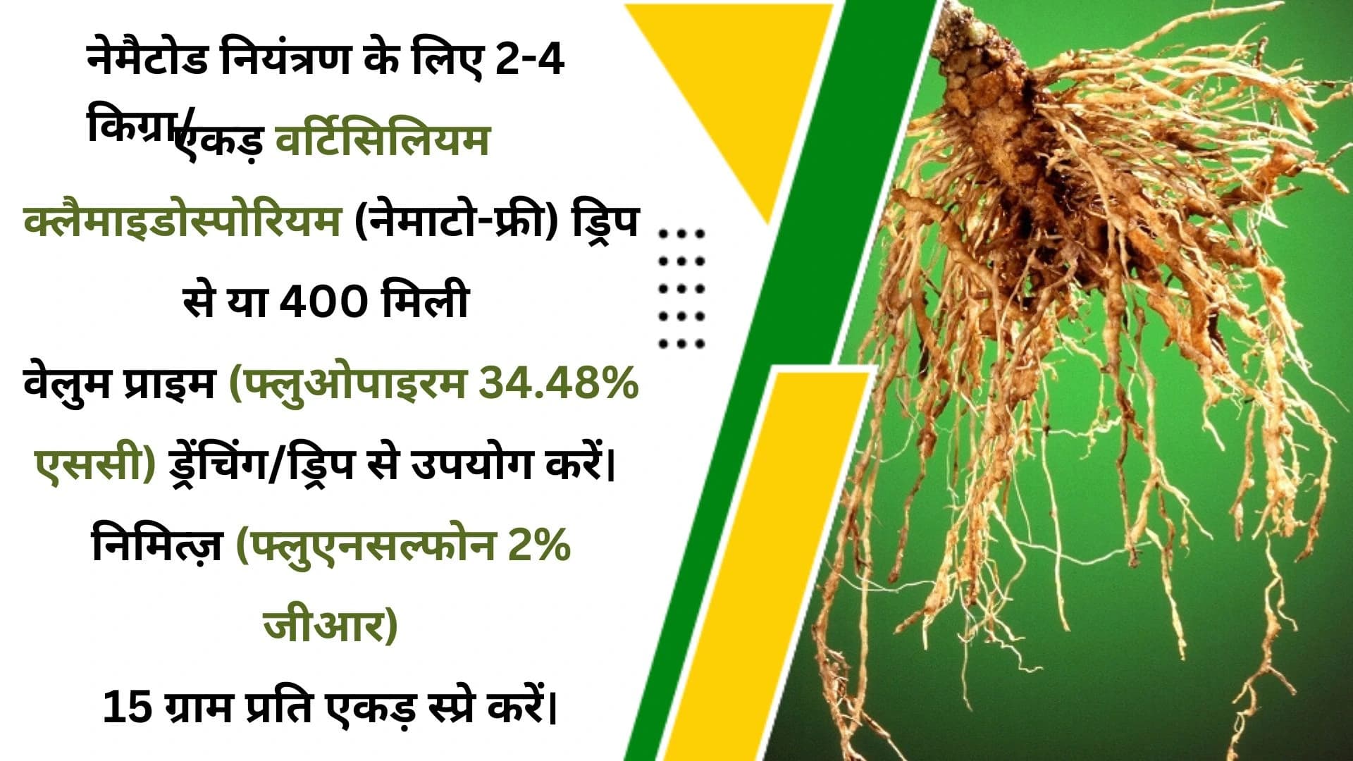 नेमैटोड नियंत्रण के लिए वर्टिसिलियम क्लैमाइडोस्पोरियम 1.0% W.P. (नेमाटो-फ्री) एक प्रभावी जैविक उपचार है, जिसे ड्रिप से 2-4 किग्रा/एकड़ की मात्रा में प्रयोग किया जा सकता है। यह फसल की जड़ों को नेमैटोड से बचाने और मिट्टी में उनकी संख्या को कम करने में मदद करता है। इसके अलावा, उपचारात्मक उपाय के रूप में वेलुम प्राइम (फ्लुओपाइरम 34.48% एससी) का 400 मिली को पानी में मिलाकर ड्रेंचिंग या ड्रिप से प्रयोग करने से नेमैटोड पर असरदार नियंत्रण पाया जा सकता है। लंबे समय तक प्रभावी परिणाम के लिए एडामा निमित्ज़ (फ्लुएनसल्फोन 2% जीआर) का 15 ग्राम प्रति एकड़ स्प्रे करें। यह रूट नॉट नेमाटोड जैसे हानिकारक कीटों से फसलों की सुरक्षा सुनिश्चित करता है।