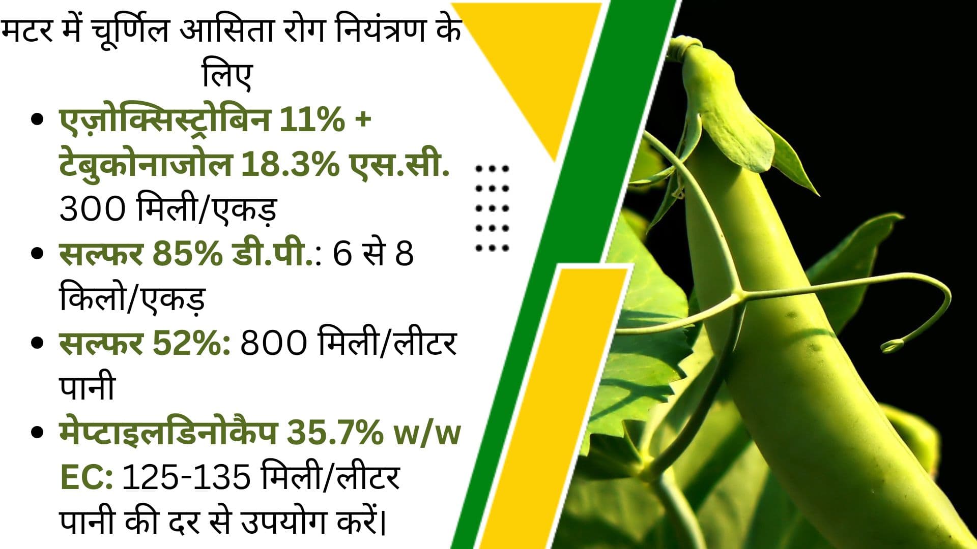 मटर की फसल में चूर्णिल आसिता रोग (पाउडरी मिल्ड्यू) एक फफूंद जनित समस्या है, जो पत्तियों, तनों और फलियों को प्रभावित कर उत्पादन में कमी का कारण बनती है। इस रोग के प्रभावी नियंत्रण के लिए विभिन्न दवाओं का छिड़काव किया जा सकता है। एज़ोक्सिस्ट्रोबिन 11% + टेबुकोनाजोल 18.3% एस.सी. का 300 मिली/एकड़ की दर से छिड़काव करें। सल्फर 85% डी.पी. का 6 से 8 किलो/एकड़ की दर से उपयोग करें। सल्फर 52% को 800 मिली/लीटर पानी में मिलाकर छिड़काव करें। साथ ही, मेप्टाइलडिनोकैप 35.7% w/w EC का 125-135 मिली/लीटर पानी में मिलाकर छिड़काव करें। इन दवाओं का सही तरीके से छिड़काव करने से चूर्णिल आसिता रोग से बचाव किया जा सकता है, जिससे मटर की फसल का उत्पादन बेहतर होता है।