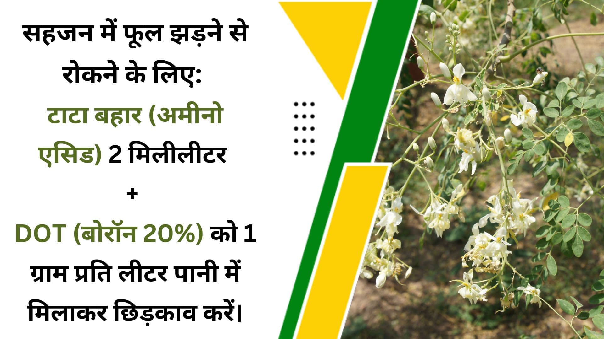 सहजन (ड्रमस्टिक) में फूल झड़ने की समस्या उत्पादन पर नकारात्मक प्रभाव डाल सकती है, जिसे रोकने के लिए सबसे पहले इसके कारणों को समझना आवश्यक है। पोषक तत्वों की कमी, कीट संक्रमण, या प्रतिकूल मौसम इसके मुख्य कारण हो सकते हैं। पोषण की कमी को पूरा करने के लिए टाटा बहार (अमीनो एसिड) 2 मिलीलीटर और DOT (डायसोडियम ऑक्टा-बोरेट टेट्राहाइड्रेट) - B-20% को 1 ग्राम प्रति लीटर पानी में मिलाकर छिड़काव करें। यह छिड़काव फूल आने के समय या उससे पहले करना चाहिए। बेहतर परिणामों के लिए सुबह या शाम के समय छिड़काव करें, जिससे पौधे पोषक तत्वों को बेहतर तरीके से अवशोषित कर सकें। साथ ही, पौधों की नियमित देखभाल करें और समय-समय पर पोषण देते रहें। कीटों और रोगों से बचाव के लिए फसल का नियमित निरीक्षण भी आवश्यक है।