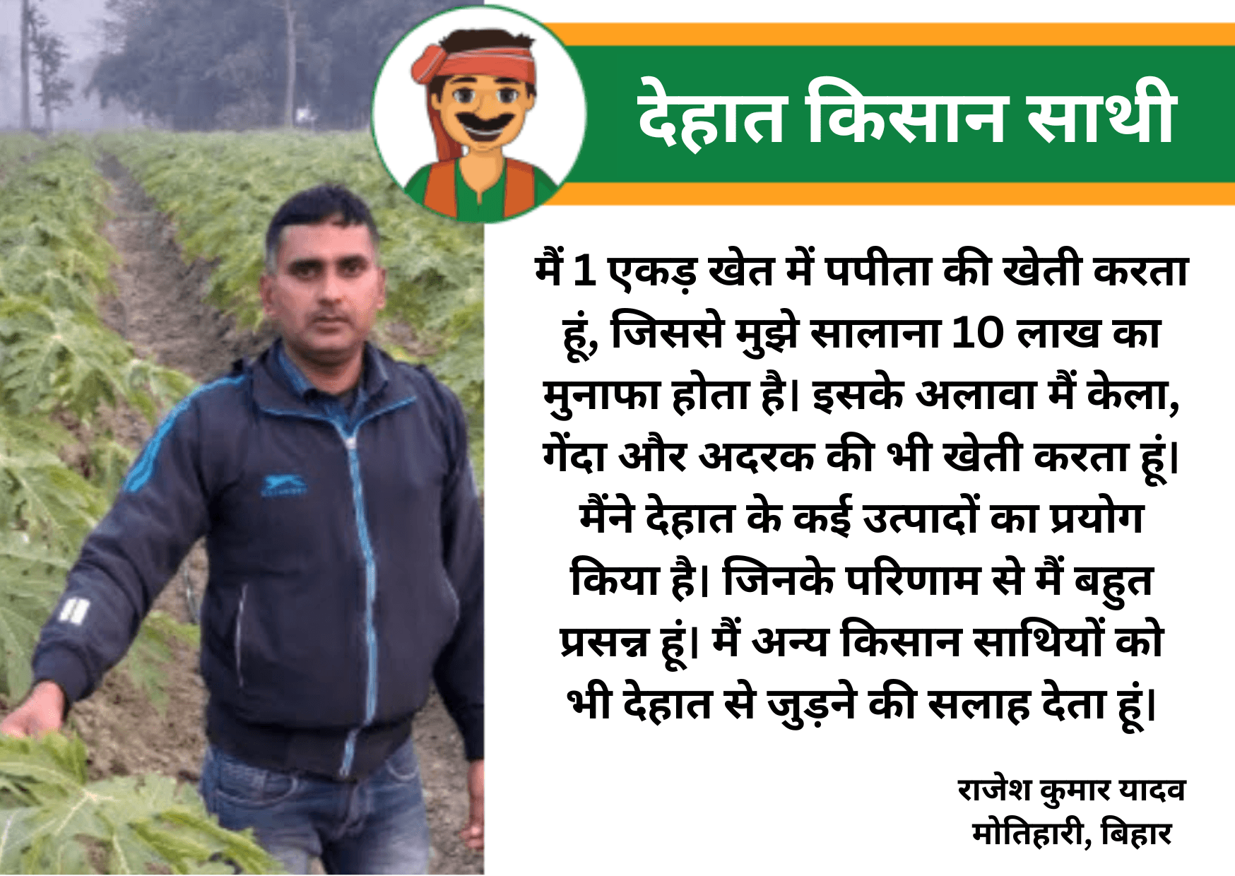 मिलिए मोतिहारी, बिहार के रहने वाले प्रगतिशित किसान राजेश कुमार यादव जी से। ये करीब 1 एकड़ खेत में ‘रेड लेडी 786’ पपीता की खेती करते हैं। इससे प्रति वर्ष इन्हें 10 लाख रुपए का मुनाफा हो रहा है। पपीता के अलावा राजेश जी मौसम के अनुसार केला, गेंदा और अदरक की भी खेती करते हैं। एक एकड़ में इन्होंने 1,200 पपीता के पौधे लगाए। जिसके 6 महीने बाद से हार्वेस्टिंग शुरू हो गई। ये हर 2-3 दिनों के अंतराल पर 4 से 10 क्विंटल तक पपीता के फलों की तुड़ाई करते हैं। राजेश जी फसलों में देहात के कई उत्पादों का इस्तेमाल किया है। जिसके परिणाम से ये बहुत प्रसन्न भी हैं।