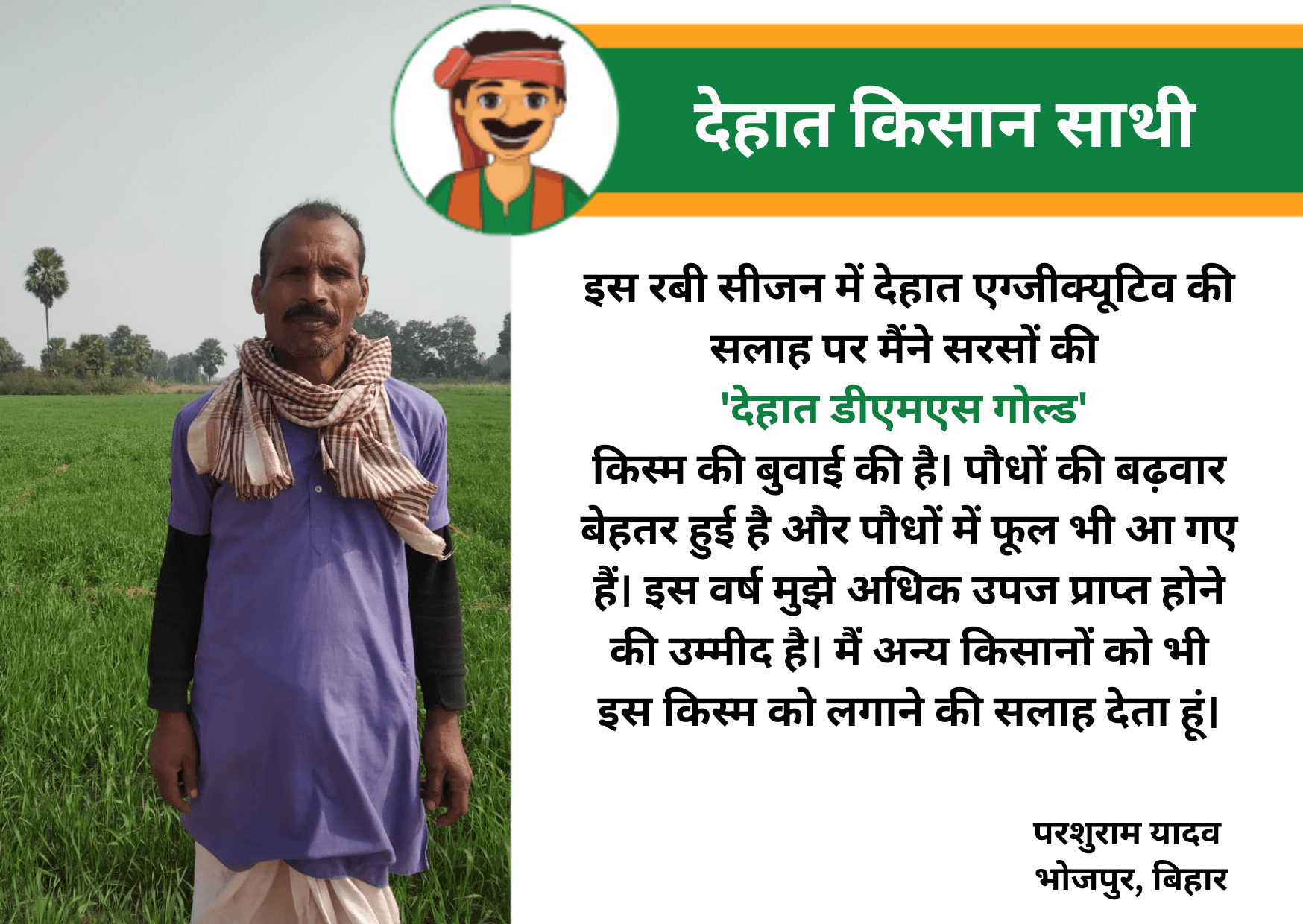 बिहार के भोजपुर जिला के रहने वाले परशुराम यादव एक प्रगतिशील किसान हैं। इस रबी सीजन इन्होंने सरसों की खेती की है। इस वर्ष देहात एग्जीक्यूटिव की सलाह पर इन्होंने 'देहात डीएमएस गोल्ड' किस्म की बुवाई की है। इनकी खेत जाने पर हमने देखा कि पौधों की बढ़वार बेहतर हुई है और पौधों में फूल भी आ गए हैं। इस वर्ष पुष्पेंद्र जी को सरसों की अधिक पैदावार की उम्मीद है।