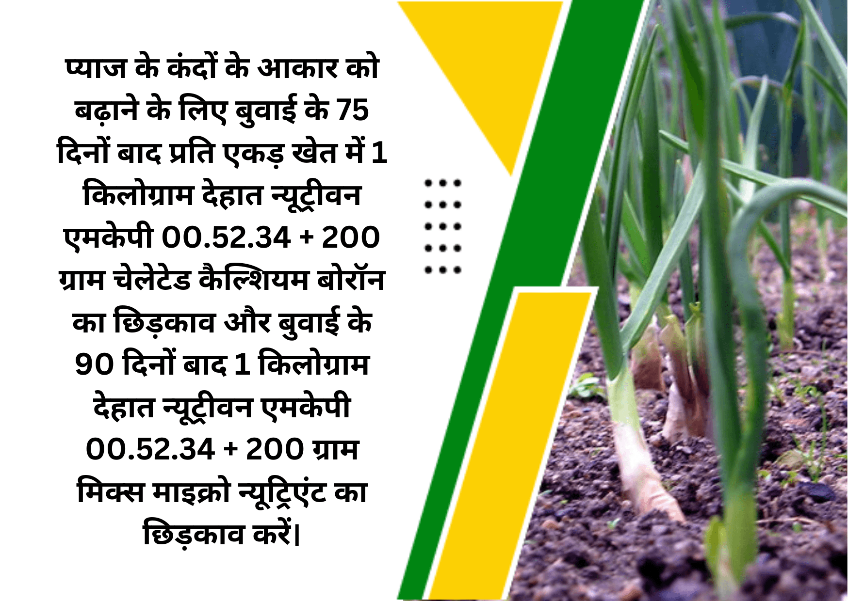 प्याज के कंदों का आकार जितना बड़ा होगा, पैदावार भी उतनी ही ज्यादा मिलती है। कंदों के आकार को बढ़ाने के लिए कई बातों को ध्यान में रखना आवश्यक है। खेत में मौजूद खरपतवार पोषक तत्वों को ग्रहण कर लेते हैं जिससे कंदों का आकार छोटा हो सकता है। मिट्टी का अधिक क्षारीय और अम्लीय होना कंदो के विकास में बाधा बनता है। बहुत अधिक ठंडी जलवायु के कारण भी प्याज में कंद नहीं बन पाते या छोटे रह जाते हैं। इसके अलावा मिट्टी में पोषण की कमी से कंद का विकास नहीं हो पाता है। पौधों एवं कंदों के बेहतर विकास के लिए बुवाई के 75 दिनों बाद प्रति एकड़ खेत में 1 किलोग्राम देहात न्यूट्रीवन एमकेपी 00.52.34 + 200 ग्राम चेलेटेड कैल्शियम बोरॉन का छिड़काव करें। बुवाई के 90 दिनों बाद प्रति एकड़ खेत में 1 किलोग्राम देहात न्यूट्रीवन एमकेपी 00.52.34 + 200 ग्राम मिक्स माइक्रो न्यूट्रिएंट का छिड़काव करें।