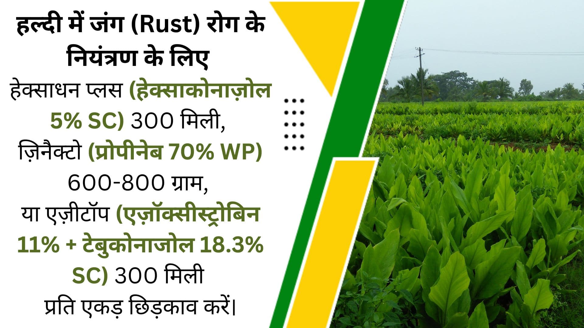 हल्दी की फसल में जंग (Rust) रोग से बचाव और नियंत्रण के लिए हेक्साधन प्लस (हेक्साकोनाज़ोल 5% एससी) 300 मिली, ज़िनैक्टो (प्रोपीनेब 70% WP) 600-800 ग्राम, या एज़ीटॉप (एज़ॉक्सीस्ट्रोबिन 11% + टेबुकोनाजोल 18.3% SC) 300 मिली प्रति एकड़ छिड़काव करें। जंग रोग के लक्षणों में हल्दी के पत्तों पर काले धब्बे दिखाई देते हैं, जिससे फसल की गुणवत्ता प्रभावित होती है। इस रोग के नियंत्रण के लिए संक्रमित पत्तियों और शाखाओं को इकट्ठा कर खेत से बाहर जला दें। बारिश के मौसम में जंग का खतरा अधिक होता है, इसलिए फफूंदनाशकों का छिड़काव 15-20 दिन के अंतराल पर करें।