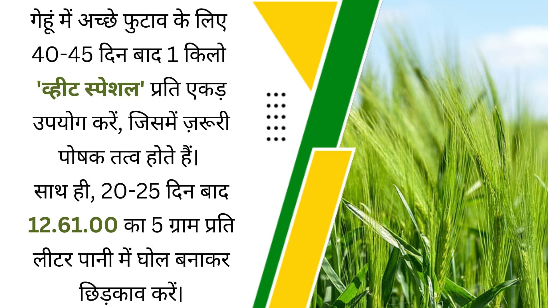 गेहूं में अच्छे फुटाव के लिए, बुवाई के 40-45 दिन बाद प्रति एकड़ 1 किलो Wheat Special का उपयोग करें। इसमें फास्फोरस (15%), पोटाश (15%), मैग्नीशियम (15%), जिंक (2.50%) और सल्फर (12%) जैसे जरूरी पोषक तत्व होते हैं, जो पौधों को स्वस्थ और मजबूत बनाते हैं। इसके अलावा, बुवाई के 20-25 दिन बाद 12.61.00 उर्वरक का 5 ग्राम प्रति लीटर पानी में घोलकर छिड़काव करें। यह प्रक्रिया गेहूं के फुटाव को बेहतर बनाने और अच्छी फसल उत्पादन में सहायक होती है।