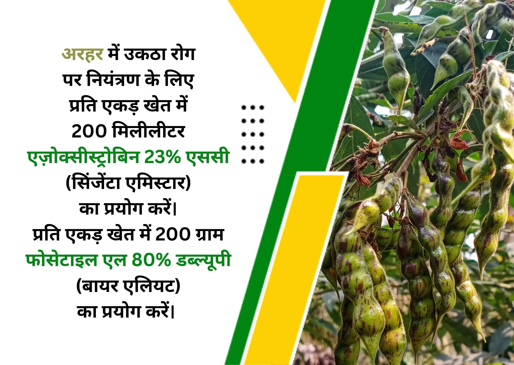 उकठा रोग एक फफूंद जनित रोग है। इस रोग के होने पर अरहर के पौधों की जड़ें काली होने लगती हैं और पौधों की शाखाएं गलने लगती हैं। प्रभावित पौधों की पत्तियां पीली हो कर गिरने लगती हैं। इस रोग से बचने के लिए फसल चक्र अपनाएं। खेत में जल निकासी की उचित व्यवस्था करें। खड़ी फसल में रोग के लक्षण नजर आने पर प्रति एकड़ खेत में 200 मिलीलीटर एज़ोक्सीस्ट्रोबिन 23% एससी (सिंजेंटा एमिस्टार) का प्रयोग करें। प्रति एकड़ खेत में 200 ग्राम फोसेटाइल एल 80% डब्ल्यूपी (बायर एलियट) का प्रयोग करें।
