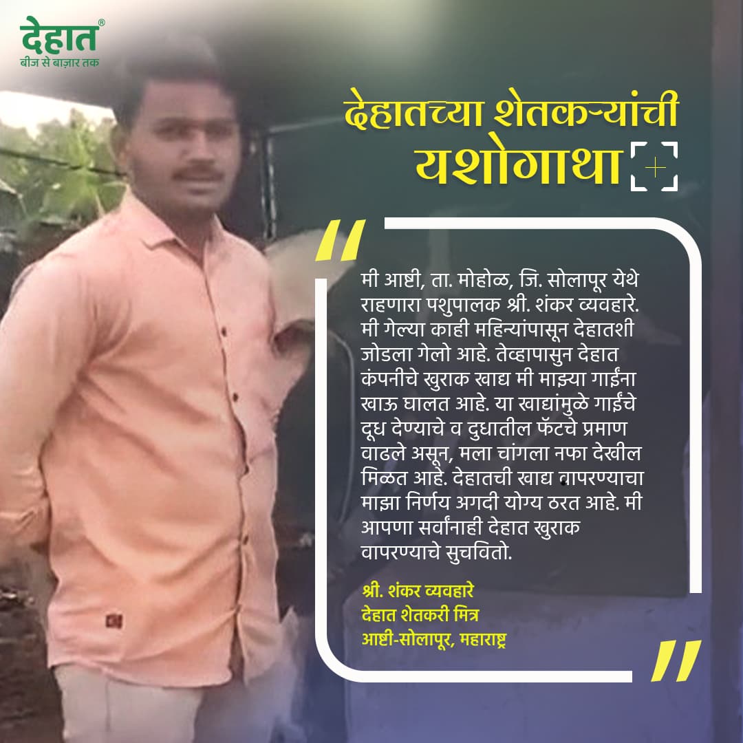 मी आष्टी, ता. मोहोळ, जि. सोलापूर येथे राहणारा पशुपालक श्री. शंकर व्यवहारे. मी गेल्या काही महिन्यांपासून देहातशी जोडला गेलो आहे. तेव्हापासुन देहात कंपनीचे खुराक खाद्य मी माझ्या गाईंना खाऊ घालत आहे. या खाद्यांमुळे गाईंचे दूध देण्याचे व दुधातील फॅटचे प्रमाण वाढले असून, मला चांगला नफा देखील मिळत आहे. देहातची खाद्य वापरण्याचा माझा निर्णय अगदी योग्य ठरत आहे. मी आपणा सर्वांनाही देहात खुराक वापरण्याचे सुचवितो.